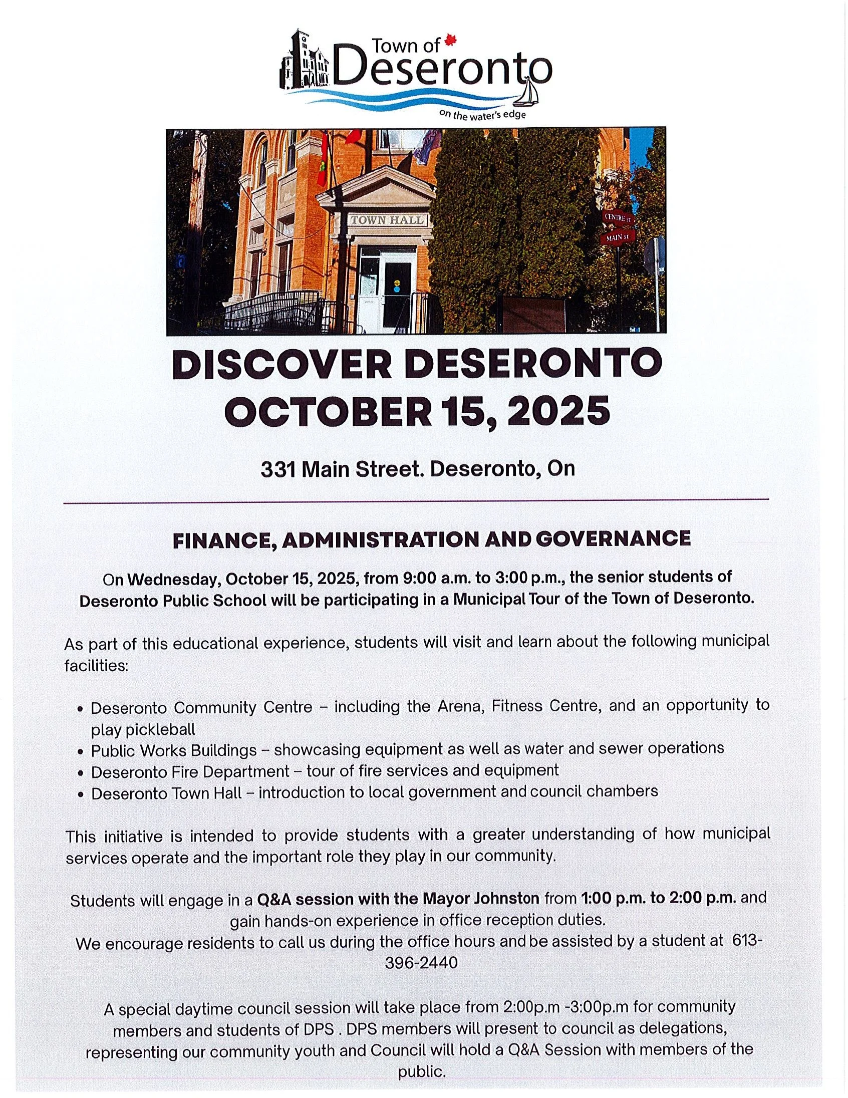 On Wednesday, October 15, senior students from Deseronto Public School will have the opportunity to gain firsthand insight into the workings of our local municipal government.