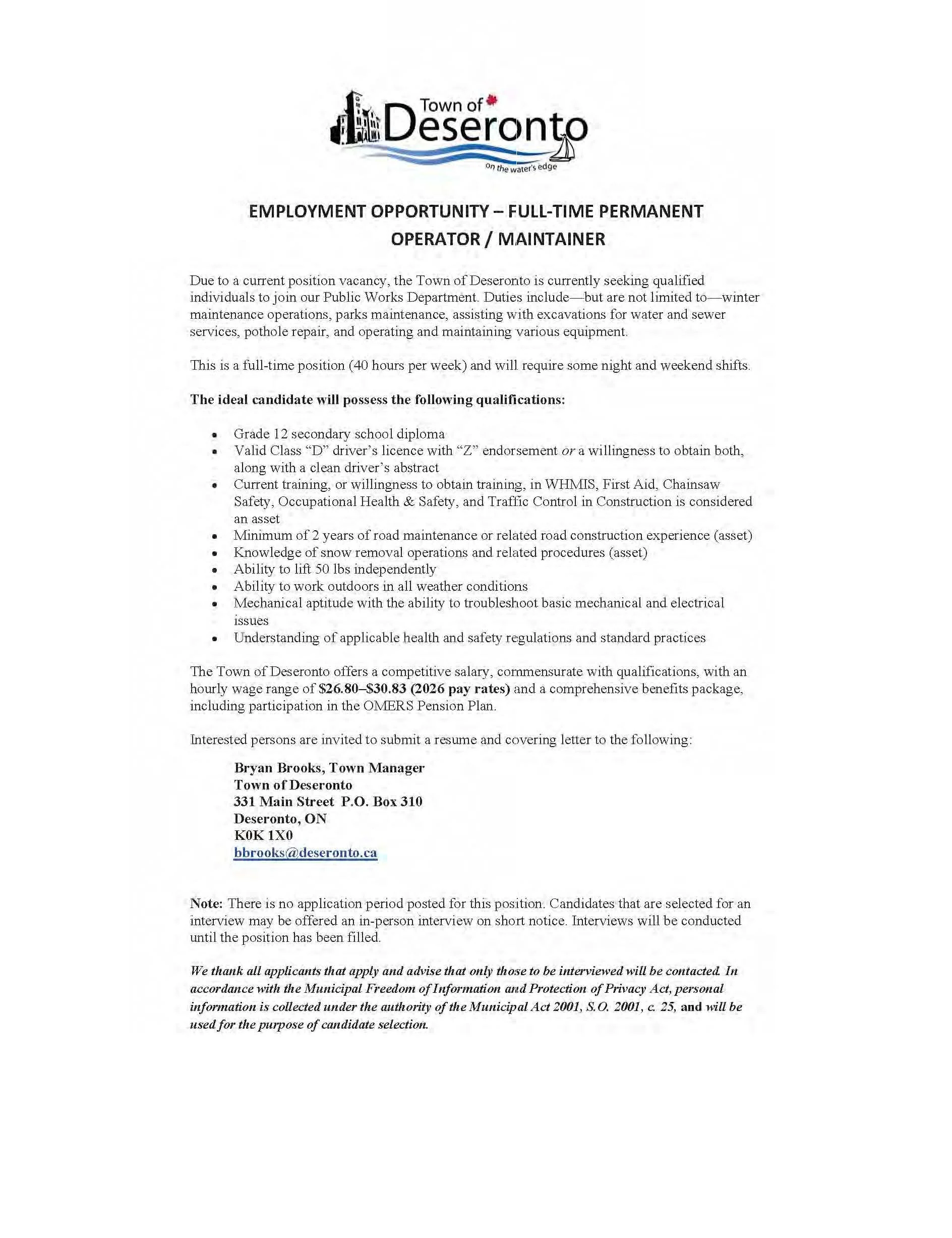 Deseronto Public Works has an immediate opening for a Permanent, Full-Time Operator/Maintainer.